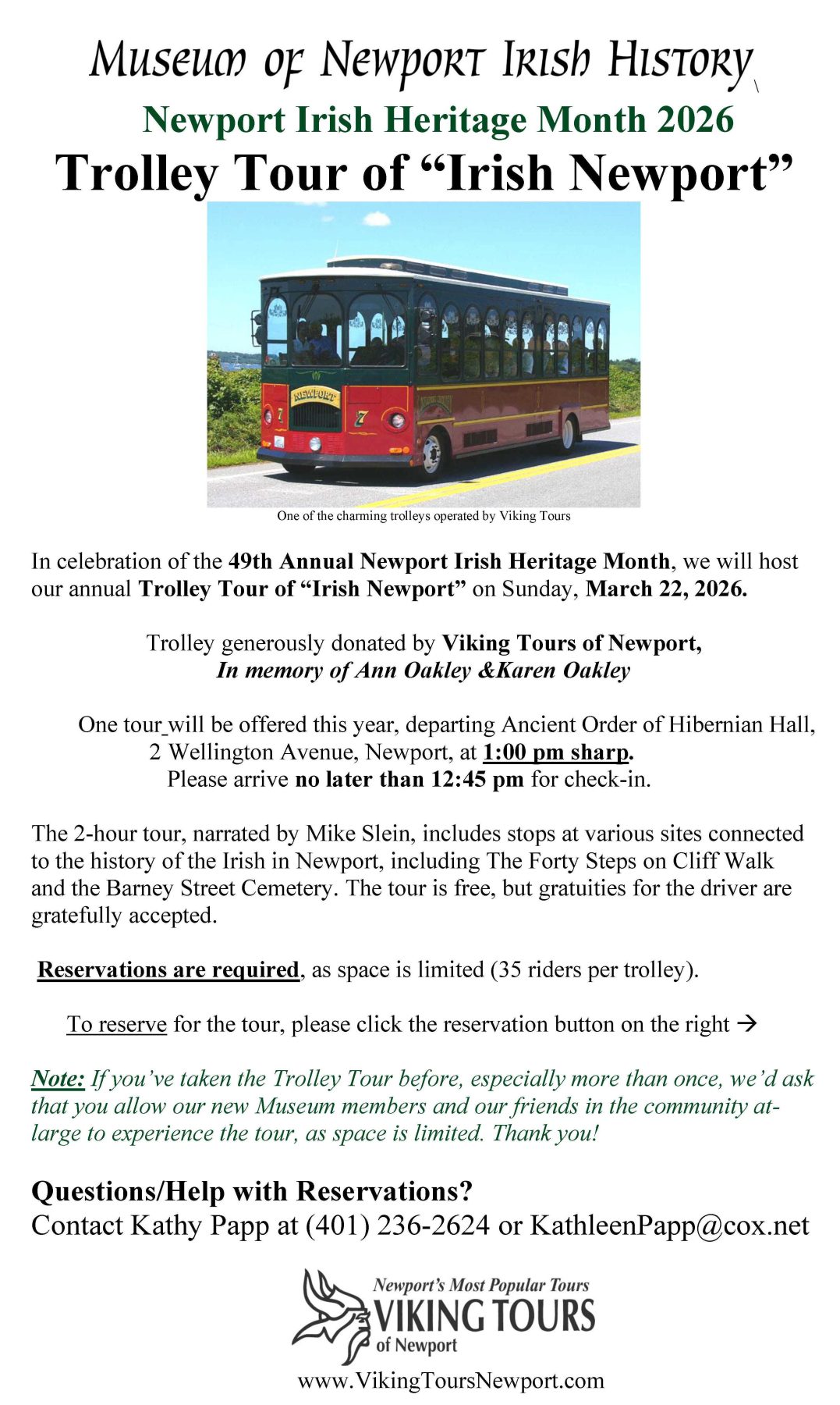 We will again offer the Trolley Tour of “Irish Newport” in March 2026, in commemoration of the 49th Annual Newport Irish Heritage Month. See details on the left.