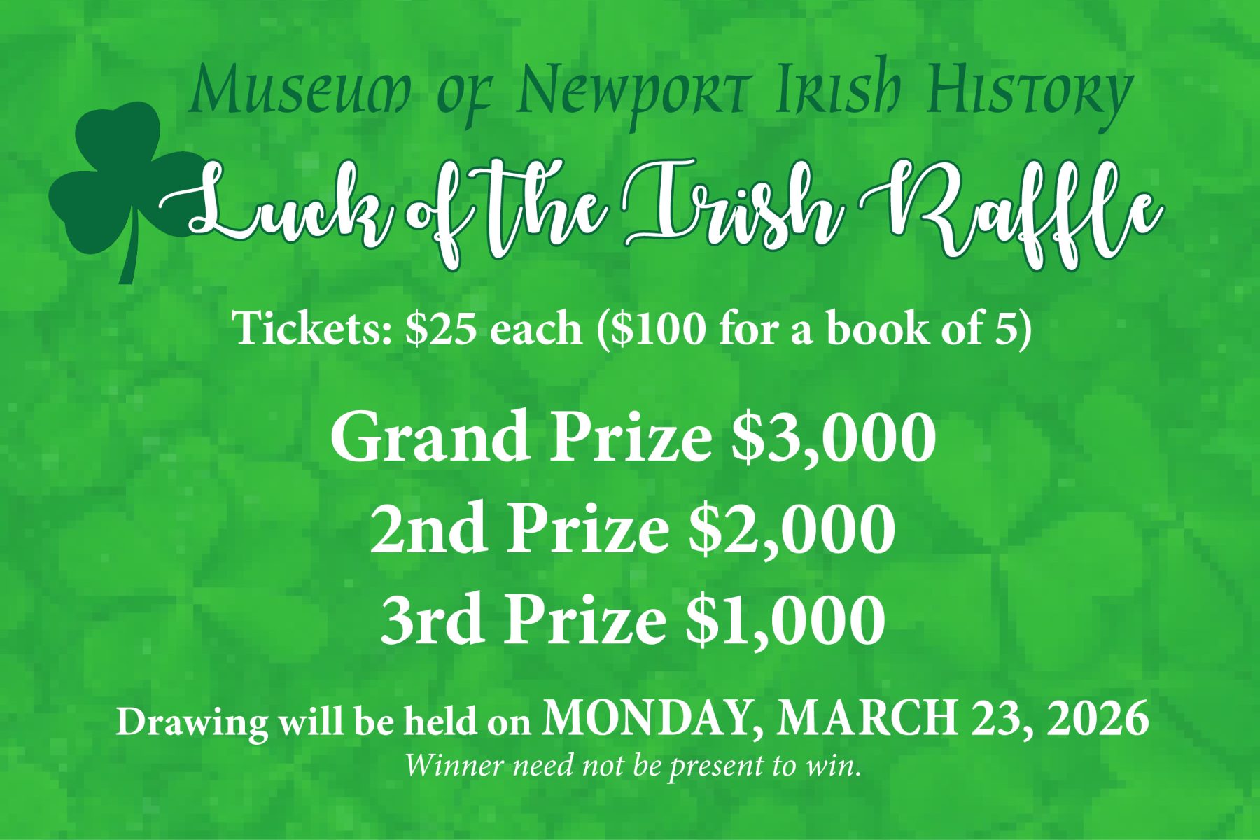 In January 2026, all Museum of Newport Irish History members of record will receive a book of raffle tickets in the mail along with THIS LETTER asking for their support of this most important fundraiser of our 2025-2026 Fiscal Year, which ends March 31, 2026 – Our third annual “Luck of the Irish” raffle!