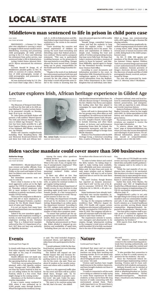 Press Rhode Island Monthly Summer Guide – “Rainy Day Activities”June 1, 2025Read ArticleE-VersionNewport Daily News – “Dancing at the Forty Steps this weekend”March 25, 2025Read ArticleE-VersionNewport Daily News – “Beyond the Parade: 5 ways to celebrate St. Patrick’s Day”March 12, 2025Read ArticleE-VersionNewport Neighbors – “Irish History Month Highlights”March 1, 2025Read ArticleNewport Daily News: Lecture by Scott B. Spencer on traditional Irish musicFebruary 22, 2025Read ArticleWhatsUpNewp.com – “Lecture to explore Irish music’s impact on identity”February 22, 2025Read ArticleE-VersionRhode Island Monthly: Must-Visit Museums offer glimpses into R.I. LifeFebruary 1, 2025Read ArticleE-VersionNewport Daily News: “5 Newport Area Holiday Events”December 11, 2024Read ArticleE-VersionNewport This Week: “Irish Museum Kids-off 23rd Annual Lecture Series Sept. 18”September 18, 2024Read ArticleWhatsUpNewp.com – Newport Irish History lecture on March 20 will focus on ‘The Great Cutter Race of 1905’”March 15, 2024Read ArticleE-VersionNewport This Week: “The Great Cutter Race of 1905″March 14, 2024Read ArticleE-VersionWPRI CBS Channel 12 Providence, R.I.: Host of “The Rhode Show” pays a pre-St. Patrick’s Day visit to the Museum of Newport Irish History Interpretive CenterMarch 14, 2024Read ArticleVideoNewport Daily News: “March offers more than St. Patrick’s Day Parade”February 28, 2024Read ArticleE-VersionNewport Daily News: “Holiday Happenings include Open house at Irish Museum”December 6, 2023Read ArticleE-VersionNewport This Week: “A conversation with Deanna Conheeny” (Museum board president)October 5, 2023Read ArticleE-VersionNewport Daily News: Irish Museum kicks off lecture series with Christine KinealySeptember 26, 2023Read ArticleRhode Island Catholic: “Historic Catholic Cemetery tours offered this October”September 21, 2023Read ArticleNewport Daily News – “Upcoming Lecture on Newport’s Kerry Hill Irish”November 12, 2022Read ArticleE-VersionNewport Daily News – “Next talk in Irish lecture series slated for Tuesday”October 15, 2022Read ArticleE-VersionNewport Daily News – “Lecture to Discuss Newport’s First Irish Mayor”March 22, 2022Read ArticleE-VersionWhatsUpNewp.com – “Lecture on March 23 will spotlight Newport’s first Irish mayor, Patrick J. Boyle”March 16, 2022Read ArticleE-VersionNewport This Week – “Irish Heritage Celebrated Throughout the City”March 3, 2022Read ArticleE-VersionNewport Daily News – “Events to get you into the Irish spirit”March 1, 2022Read ArticleE-VersionNewport Neighbors – “Newport’s Early Irish Community: Where it all Began”March 1, 2022Read ArticleE-Version
